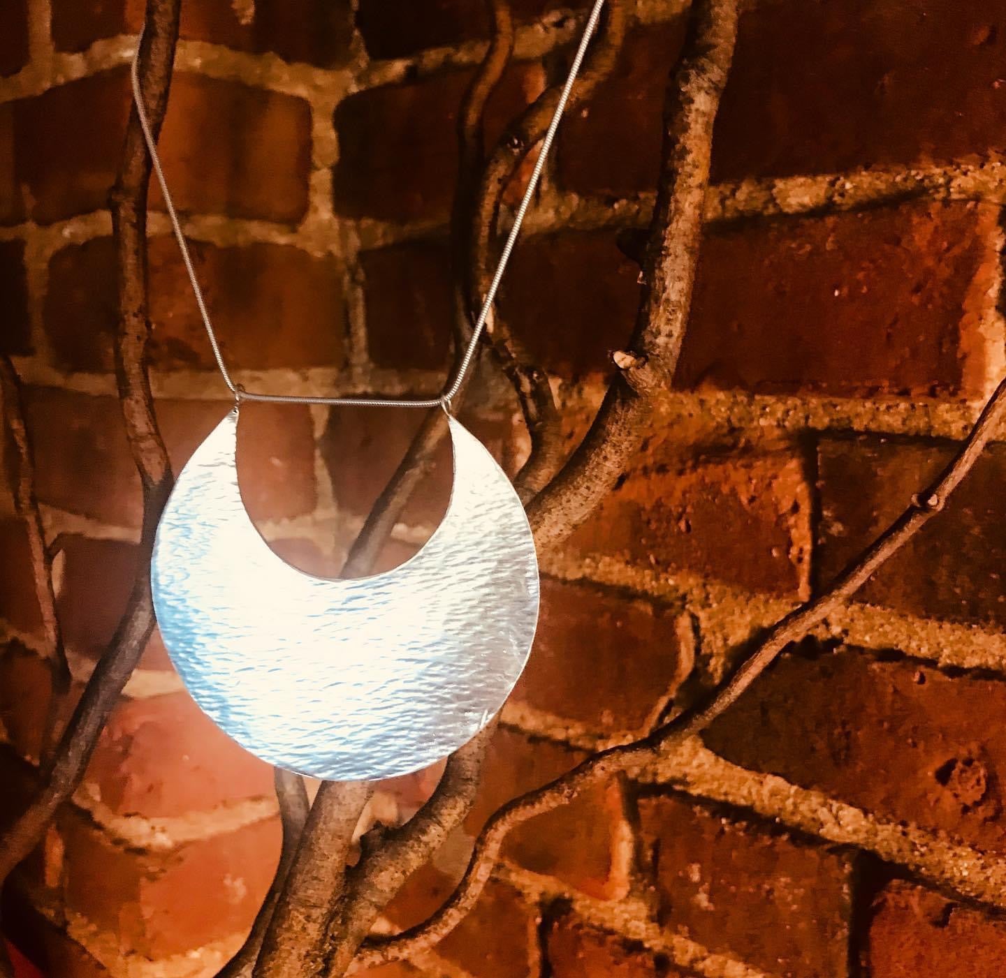 This stunning necklace is from my Luna Collection. It is a half moon necklace with a hand hammered finish. The Luna pendant floats gracefully from a lovely 16" sterling silver chain. A delicate pearl adorns the back of the necklace, adding an enchanting touch..